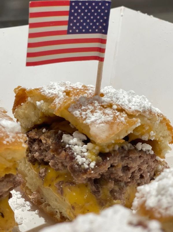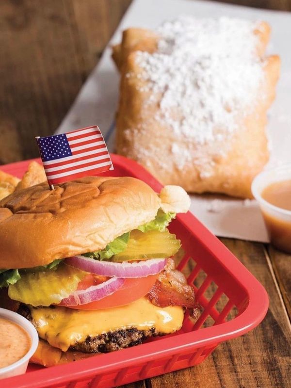 Our seasoned smash patty with cheese enclosed in two of our made from scratch beignets before it's deep fried & covered with powdered sugar. Served with your choice of Bay Sauce or our Signature Buttercream Syrup for dipping!